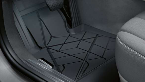 Precisely fitted protection against moisture and dirt in the front footwell. Featuring a black design with a stainless steel inlay, they perfectly complement the interior.