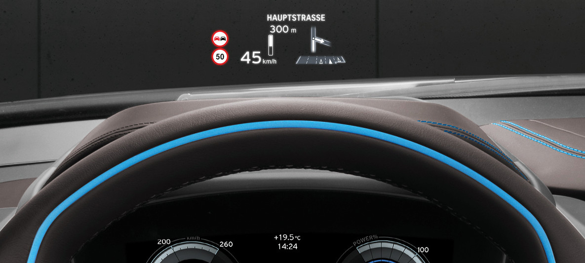 The symbols projected onto the windscreen appear in full colour with brilliant resolution so that traffic symbols are depicted realistically. The displays appear in a position that is especially ergonomically favourable on the windscreen, which you can adapt individually.