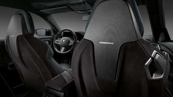 The M Carbon bucket seat with illuminated M2 logo and M colour accents combines the lightness and racing character of a bucket seat with the range of functions of an M sport seat. Its fit provides optimum lateral support and high long-distance comfort. The seat is compatible with multipoint harnesses and therefore fully suitable for racing.**