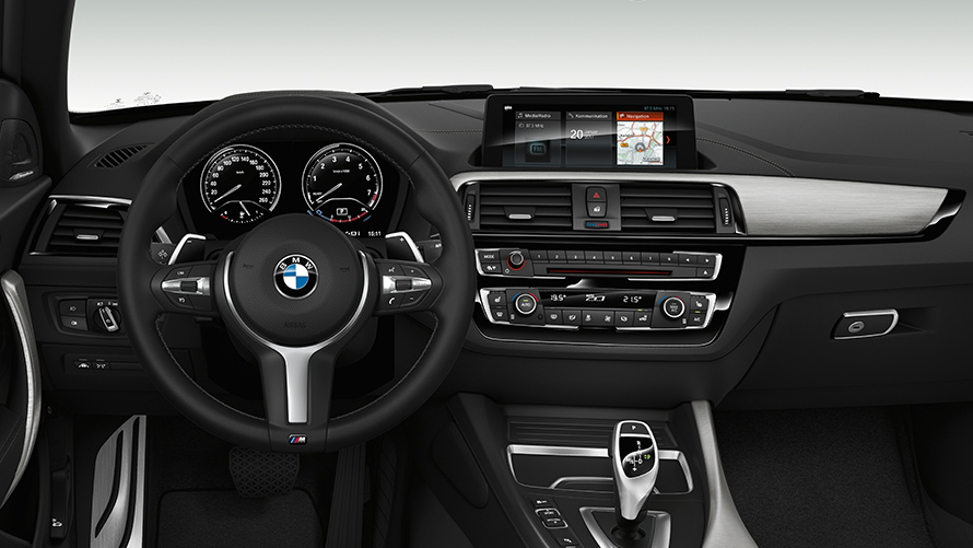 In the driver-oriented interior of the BMW M240i Convertible, high-quality details set sporty accents. Examples include the digital model designation and the fine chrono scaling in the instrument cluster. Elements specific to M Performance, such as the M sport leather steering wheel, ergonomic M sport seats and padded knee supports offer perfect steering and ride comfort. And exclusive details such as the door sill finishers with model designation impressively round off the sporty and elegant atmosphere.