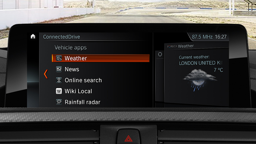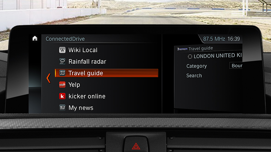 The offer includes access to current location-based information such as weather and news, as well as an online search powered by GoogleTM and practical office functions. Services and features such as parking information, as well as travel and hotel guides can be accessed directly in the car without a smartphone via the ConnectedDrive menu.