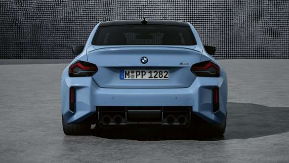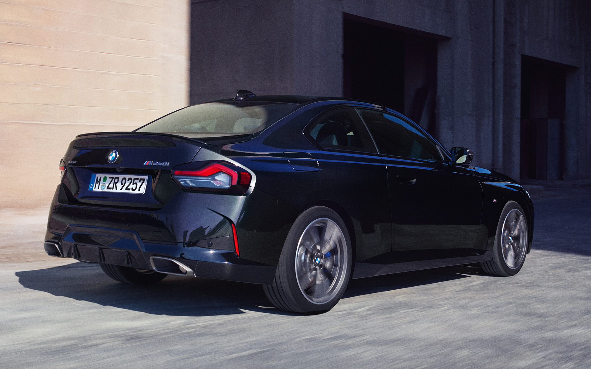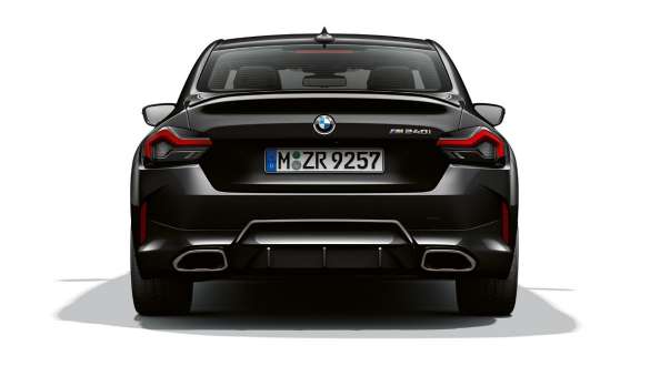 Setting sporty accents at the rear of the BMW M240i Coupé and the BMW M240i xDrive Coupé are the M-specific rear apron and the rear spoiler in body colour supplied as a standard feature. Free-form exhaust pipe finishers in Cerium Grey round off the athletic appearance.