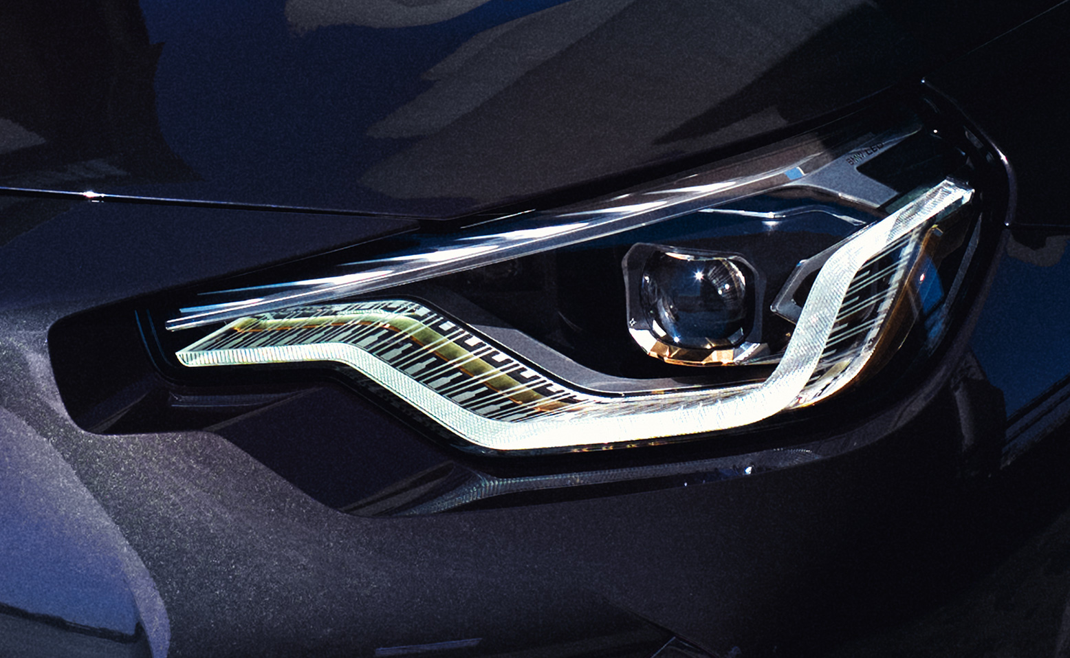 Dynamic box design with extended bonnet, short overhangs and recessed greenhouse.