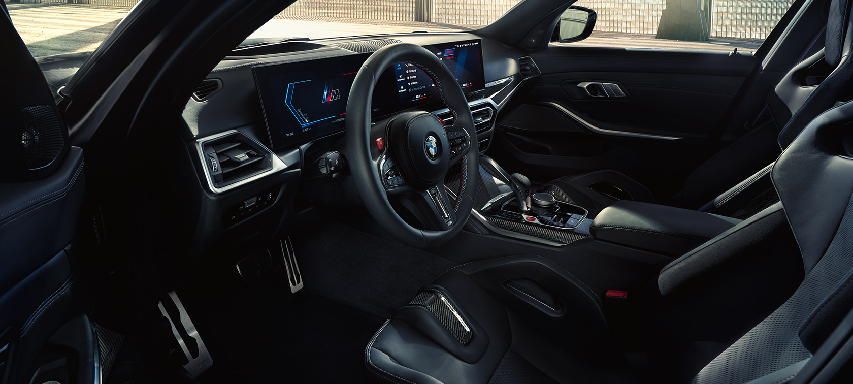 The M Carbon bucket seat with illuminated M3 logo combines the racing character of a bucket seat with the comfort of an M sport seat. It is lighter, electrically adjustable and has visible carbon surfaces. The backrest and seat bolsters have cut-outs for multi-point belts and the head pad can be removed for driving with a helmet.