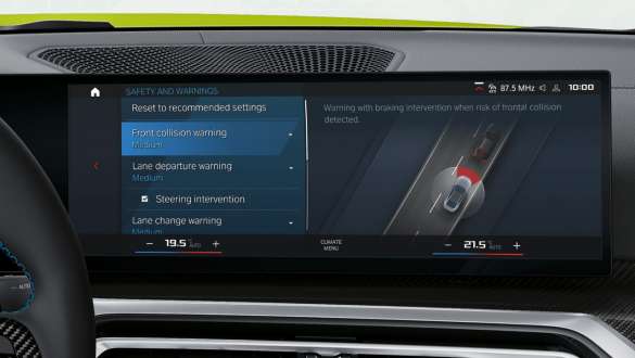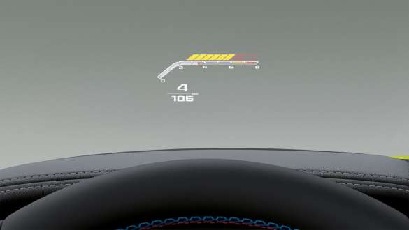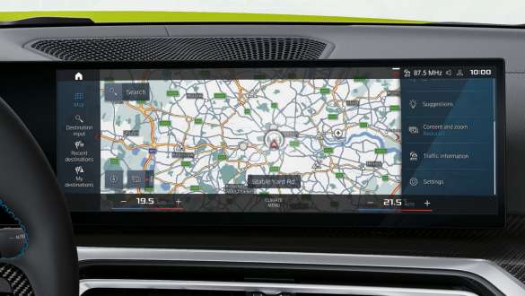 The full-colour BMW Head-Up Display with M specific functions* projects information relevant for the journey directly into your field of vision. With the press of a button, the driver can switch to the M specific display, which includes a gear indicator, the rpm as a dynamic range curve with shift lights indicating the optimal moment to shift as well as navigation tips.