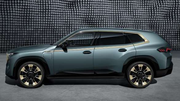 The side view combines the strong character of the design in coupé style with powerful proportions and styling highlights such as the darkest windows of the entire BMW model range. Both the 23” light alloy wheels and the accent band that make the shaping of the BMW XM unique create an especially exclusive effect in the accent colour Night Gold.