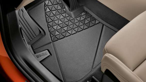 The perfectly fitted BMW all-weather floor mats protect the front footwell against moisture and dirt. In Black with BMW lettering.