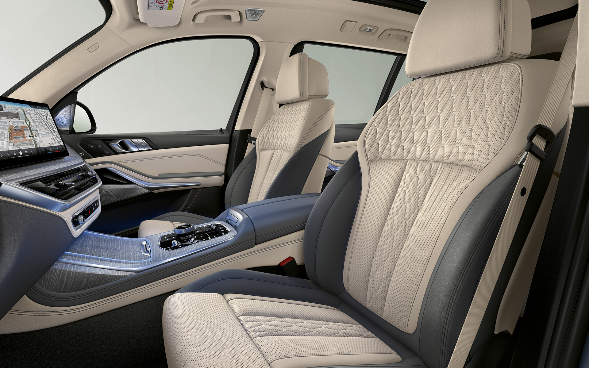 The interior of the BMW X7 impresses with its use of especially high-grade materials. Exclusive accents such as 'CraftedClarity' glass applications for the gear selection lever, the iDrive Controller and the start/stop button impressively underline this effect.