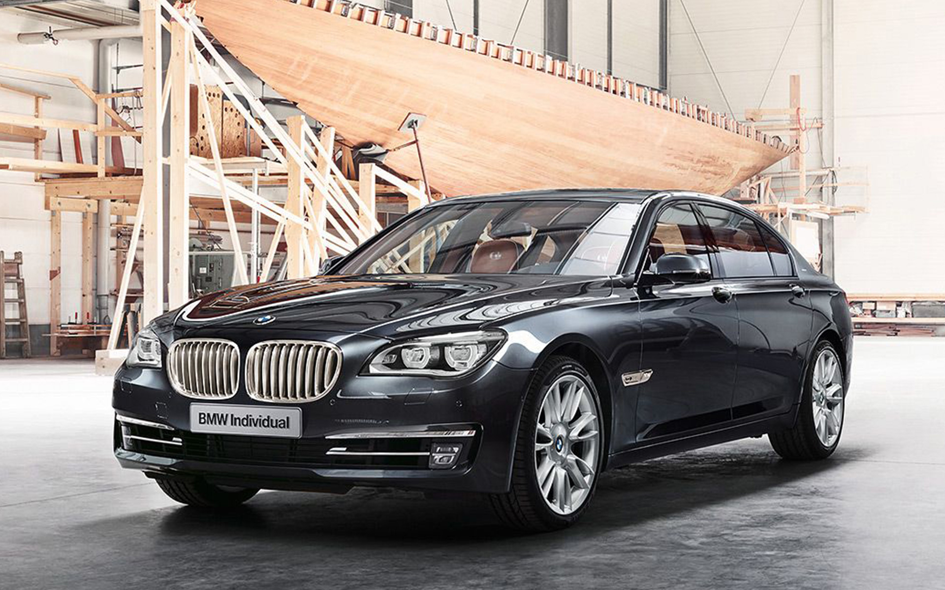 BMW Individual 760Li Sterling inspired by ROBBE & BERKING F01 2013 in front of sailing yacht in shipyard hall
