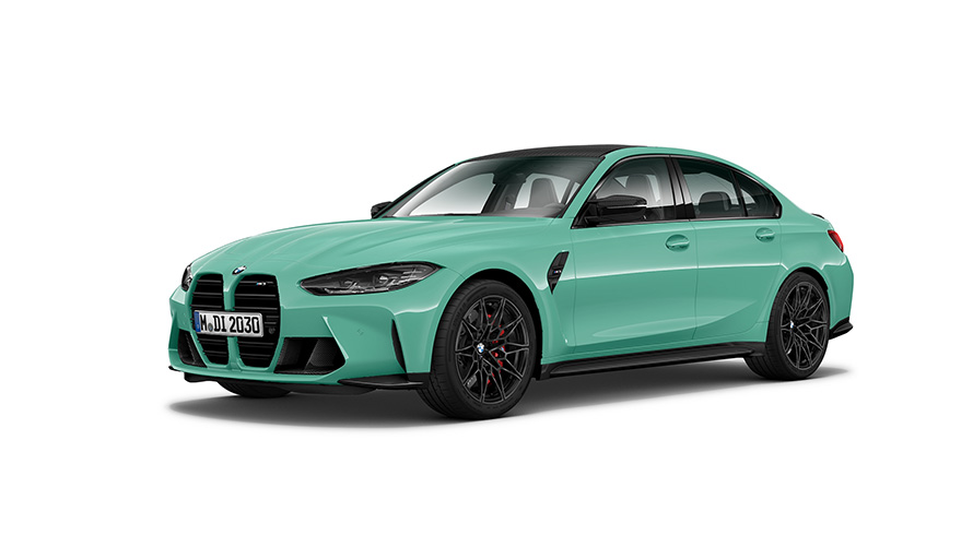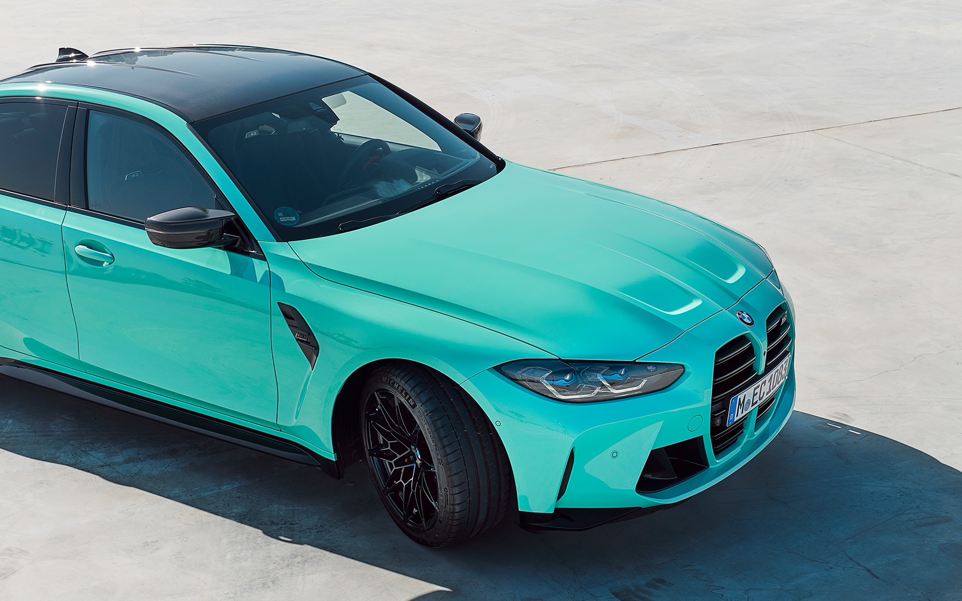 BMW M3 Sedan G80 2021 BMW Individual Mint Green three-quarter side view