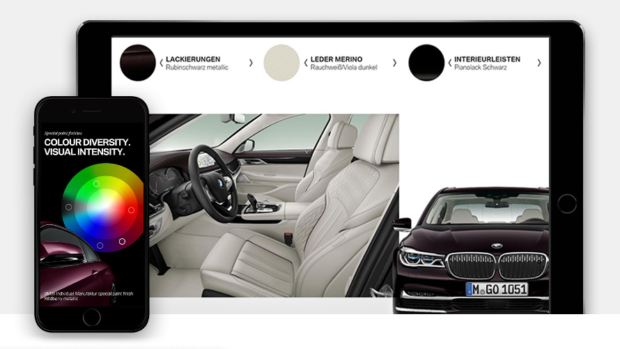 Explore the exclusive world of BMW Individual in all of its facets – interactively by smartphone or tablet. Our intuitive apps show the variety of the BMW Individual Collection and the unlimited options of BMW Individual Manufaktur.
